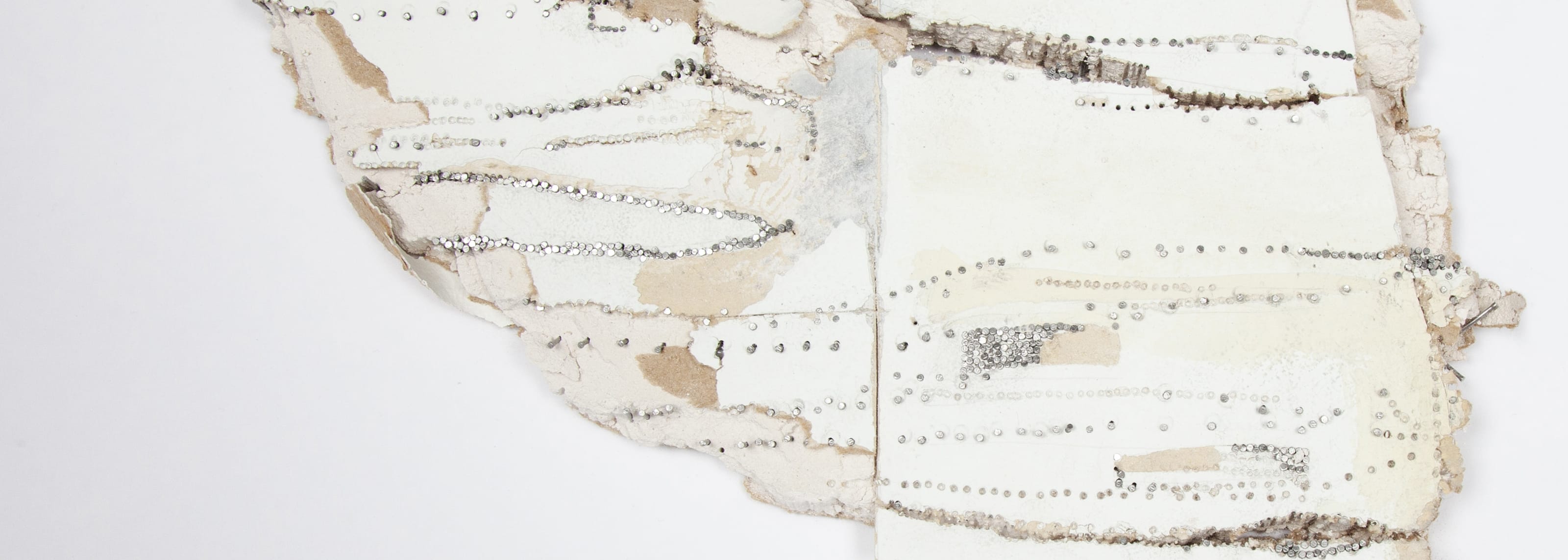 In installations, nails are drawn into a wall, paper “pieces” are collaged directly on the wall, in dialog with the architectural space. The imagery moves through grid systems to idiosyncratic drawings, referring to existence within those beautiful, monochrome, light-filled spaces; surrogates for sites of experience.
